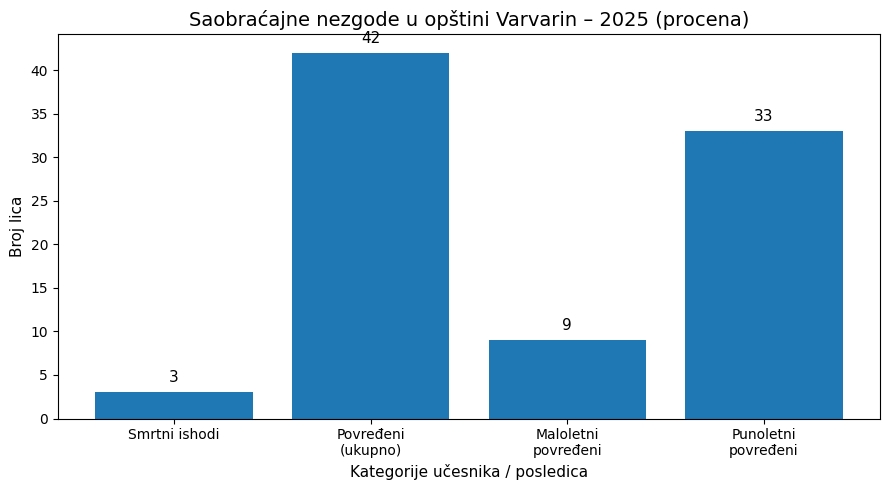Statistički podaci pokazuju da se na teritoriji opštine Varvarin svake godine beleži više desetina saobraćajnih nezgoda, pri čemu su najčešći uzroci ljudski faktori – neprilagođena brzina, nepoštovanje saobraćajnih propisa, korišćenje mobilnih telefona tokom vožnje i vožnja pod dejstvom alkohola. Iako infrastrukturni uslovi imaju uticaj na bezbednost, upravo ovi podaci ukazuju da bez promene navika nije moguće postići trajno smanjenje broja nezgoda i posledica po učesnike u saobraćaju.